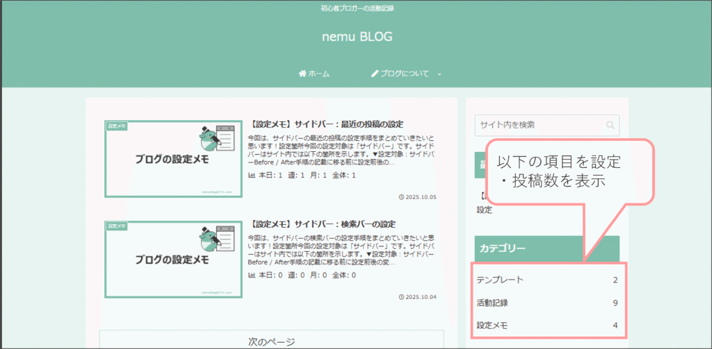 カテゴリーの設定は組み合わせによって見やすさがだいぶ違うことに気づきました。特に「投稿数を表示」は他の項目との組み合わせで見やすさが大きく変わります。より見やすいサイト作りのためにも様々な組み合わせを試してみる事が大切ですね!
