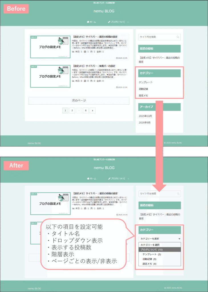 ※Before / Afterの画像は「ドロップダウンで表示」「投稿数を表示」「階層を表示」の全てに「✓」を付けている状態です。