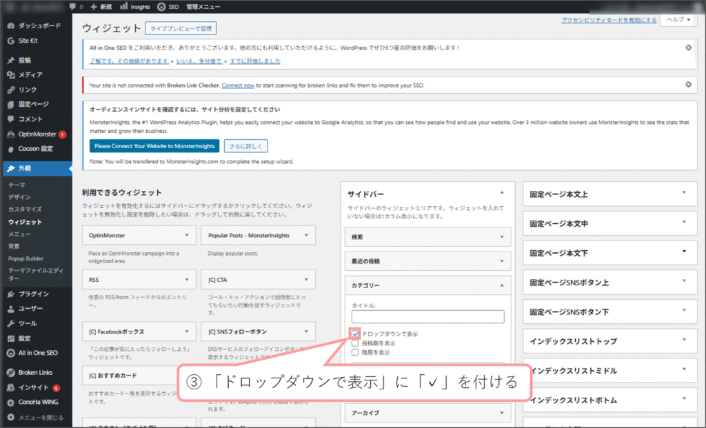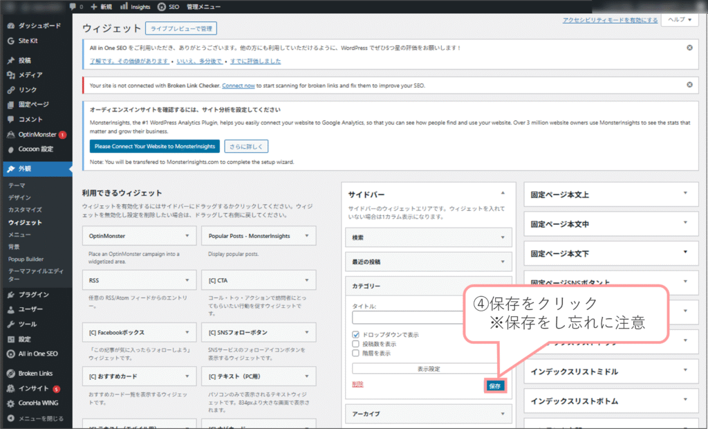 ①「カテゴリー」ウィジェットを設定したウィジェットエリアをクリック