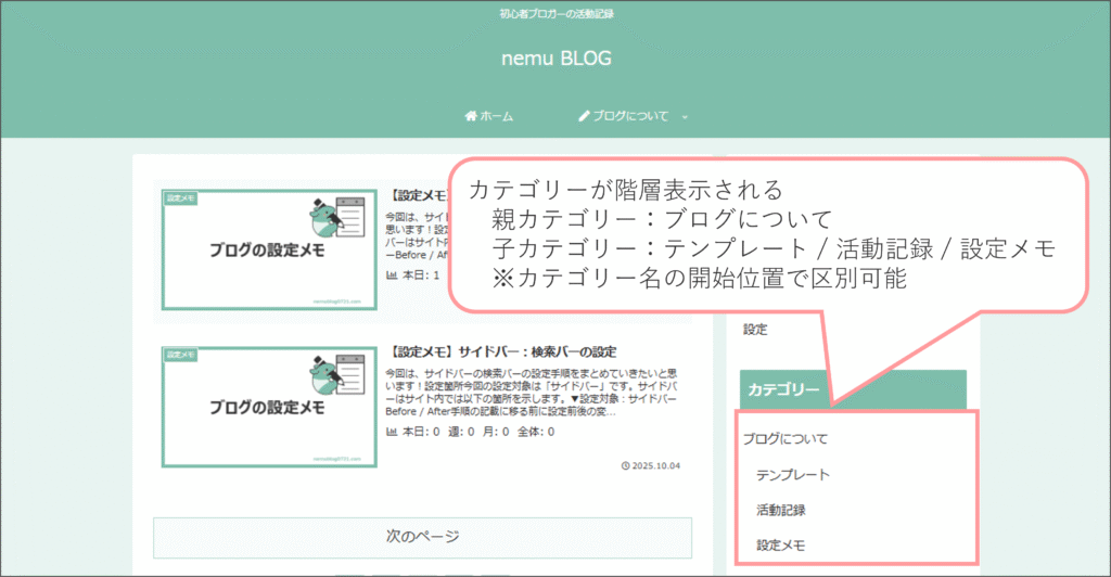 ※子カテゴリにはカテゴリー名の前に「ー」が表示されます。この表示になっていれば階層を表示