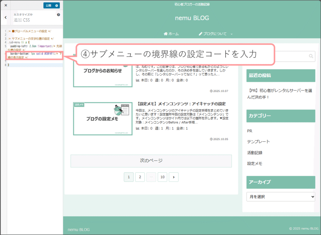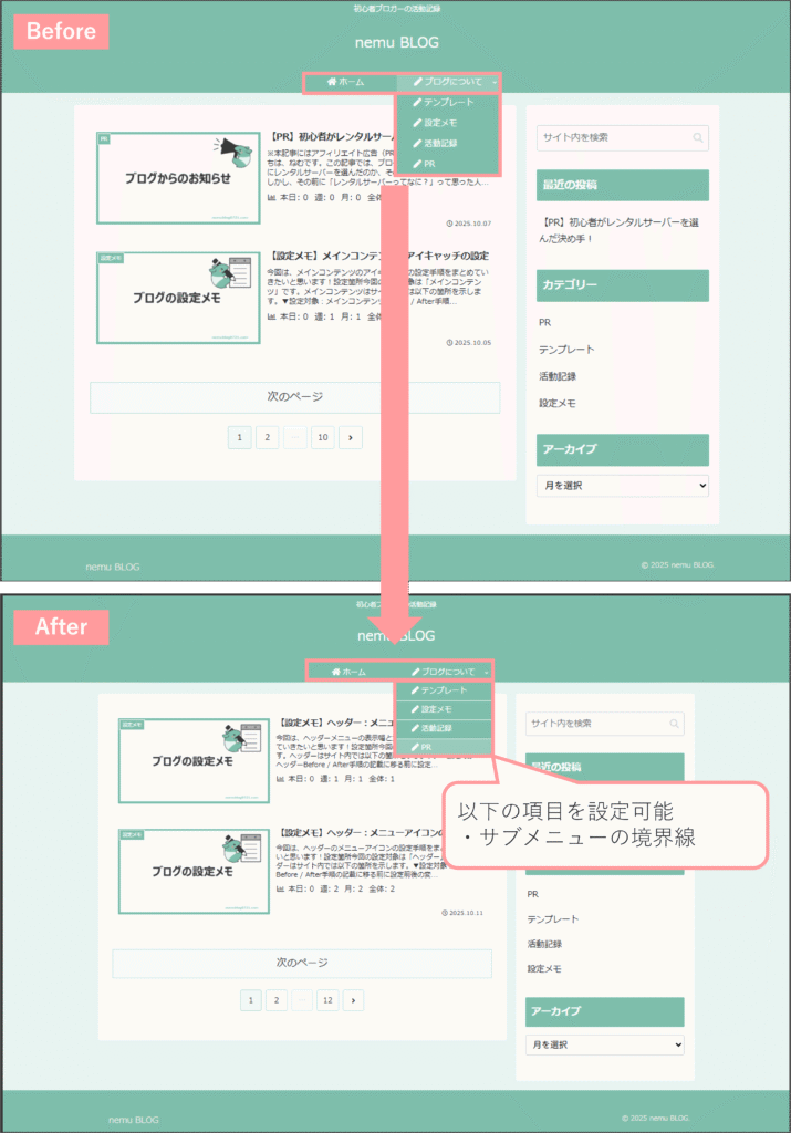 【設定メモ】ヘッダー:サブメニューの境界線の設定