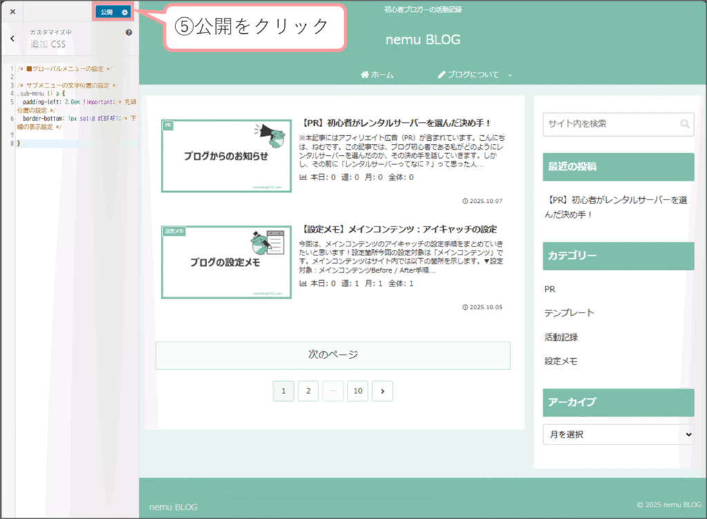 今回の境界線、前回の文字位置同様に追加CSSの設定対象は「sub-menu」です。この対象によって設定が影響する範囲が変わってくるため、対象範囲を良く考えたうえで設定する必要があります。メニュー全体に設定したい項目なのに、サブメニュー、トップメニューでそれぞれ設定してしまうと、変更するたびに2つのコードを設定する必要があり、作業量が増えてしまいます。