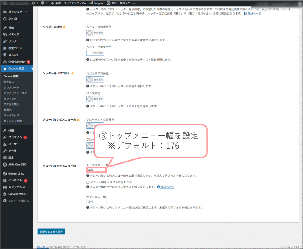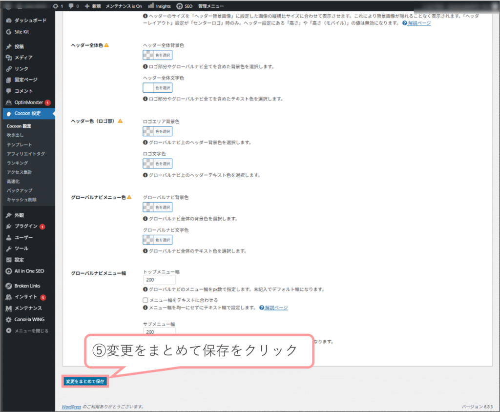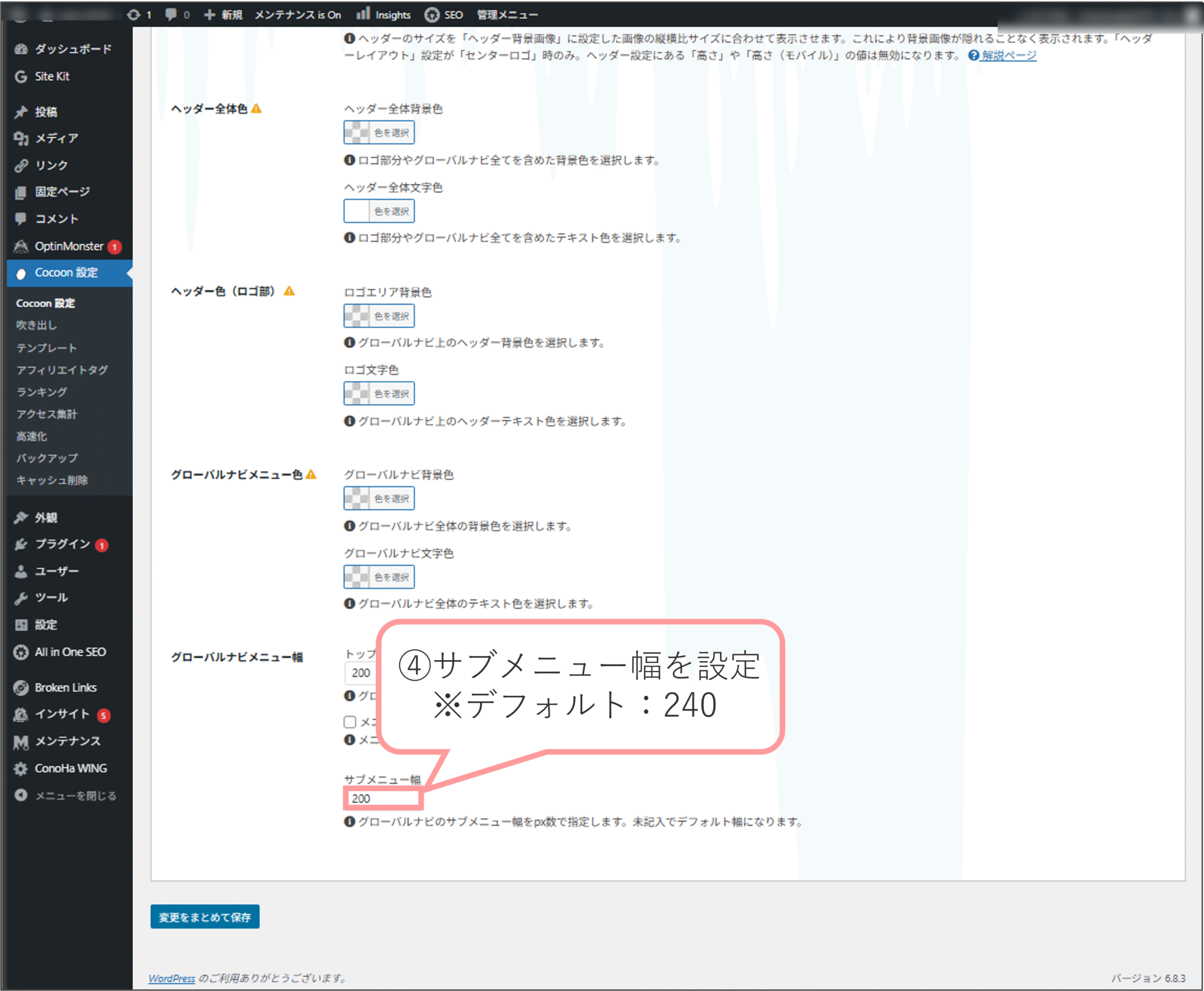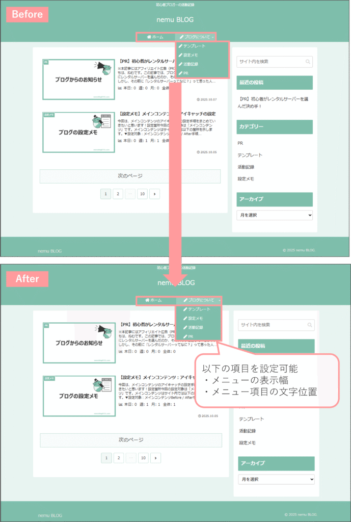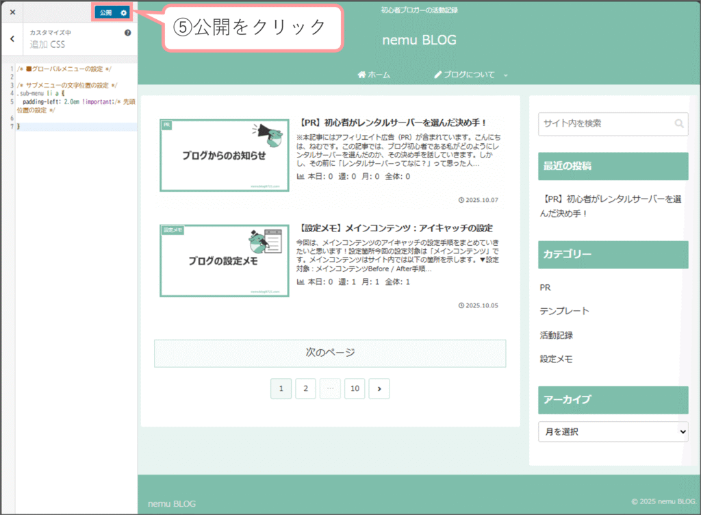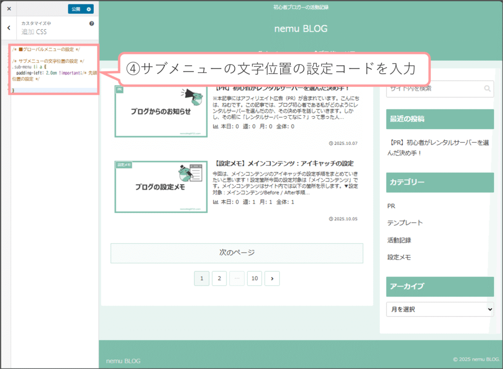「メニュー項目の文字位置の設定」の設定にて追加CSSがうまく反映されないことから優先度を一番高くするために「!important」を使用しましたが、使用時には注意が必要です。