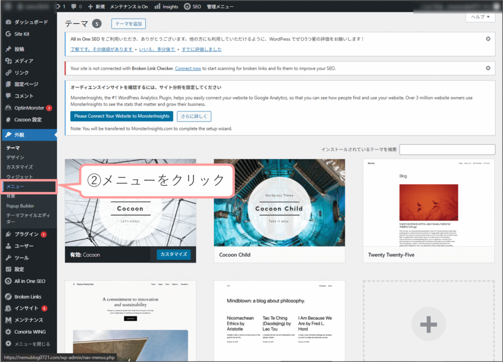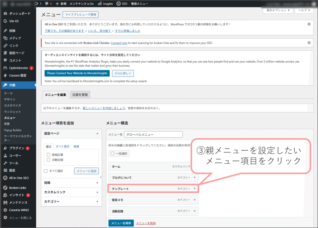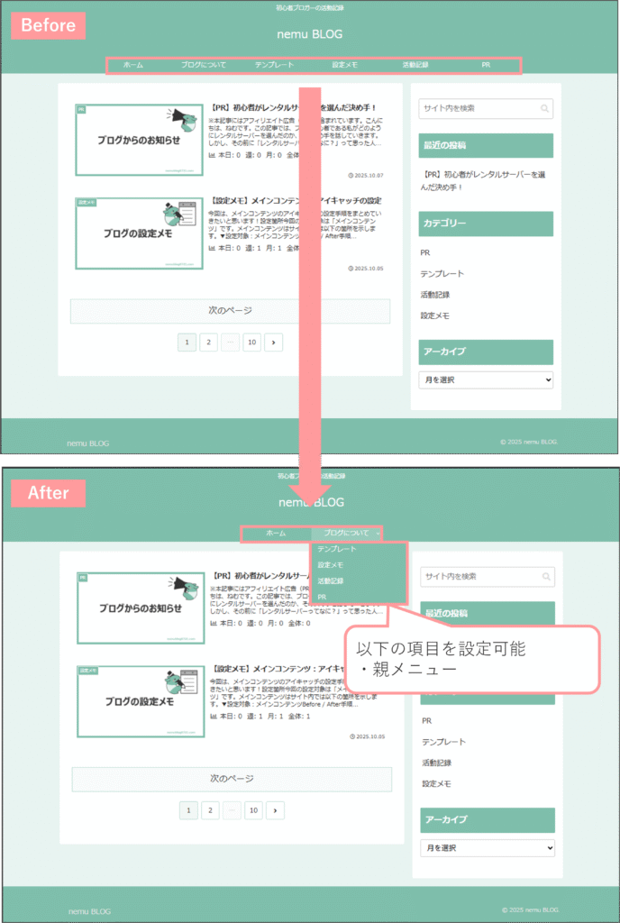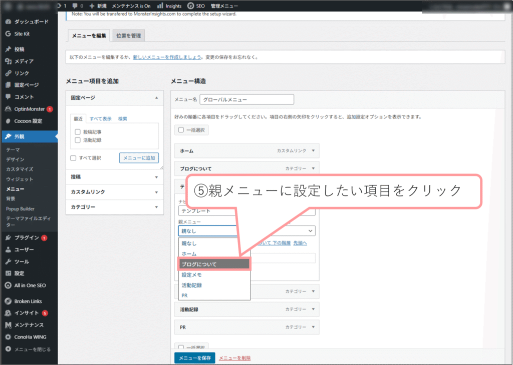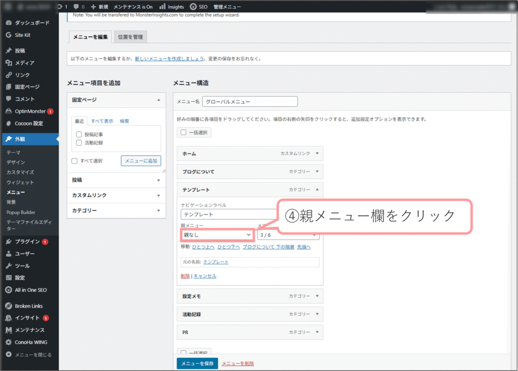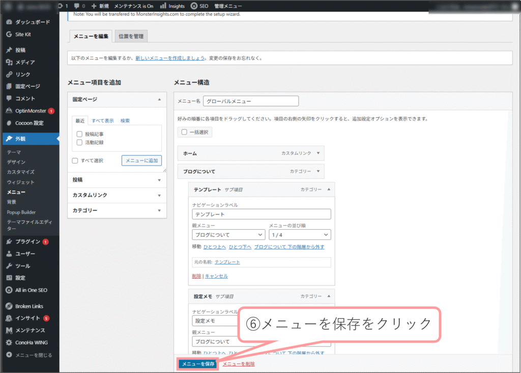 【設定メモ】ヘッダー:メニューの新規作成で使用した「カスタマイズ」はプレビュー画面があり、見ながら調整できる安心感と直感的な操作ができるイメージでした。それに対して、今回使用した「メニュー」はテキスト情報のみで軽快でシンプルな操作感だと感じました。動作が軽快なため頻繁に変更する人におすすめです。
