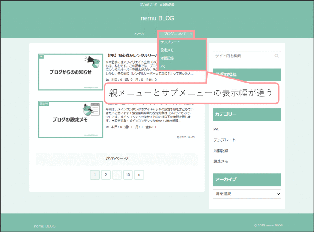 【設定メモ】ヘッダー:メニューの新規作成で使用した「カスタマイズ」はプレビュー画面があり、見ながら調整できる安心感と直感的な操作ができるイメージでした。それに対して、今回使用した「メニュー」はテキスト情報のみで軽快でシンプルな操作感だと感じました。動作が軽快なため頻繁に変更する人におすすめです。